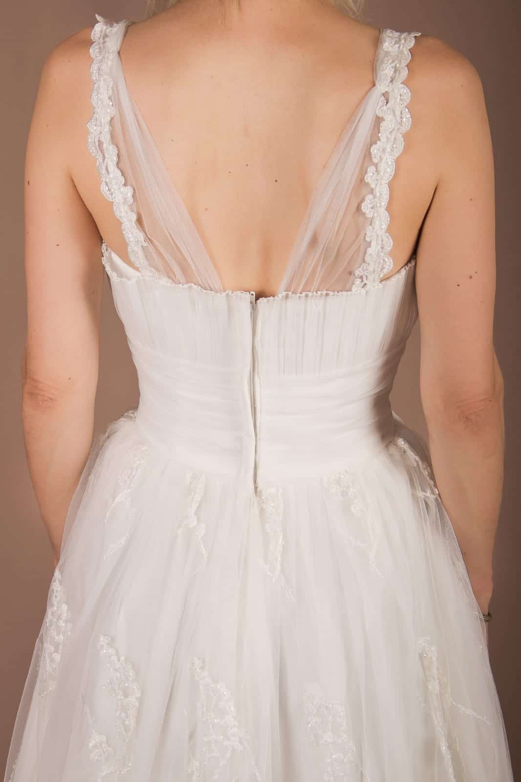 A-line, Ivory wedding dress with lace detail. The lace was added after purchase, lace detail also added on the straps and dress altered around middle to be more form fitting. Includes beautiful beaded hem veil. All excellent condition.