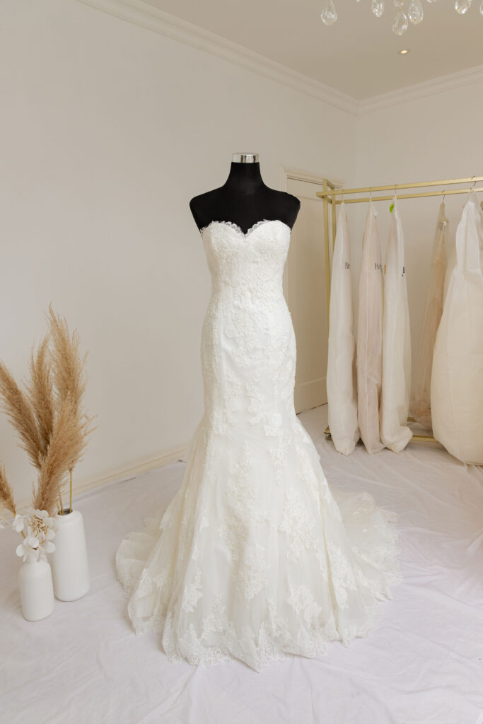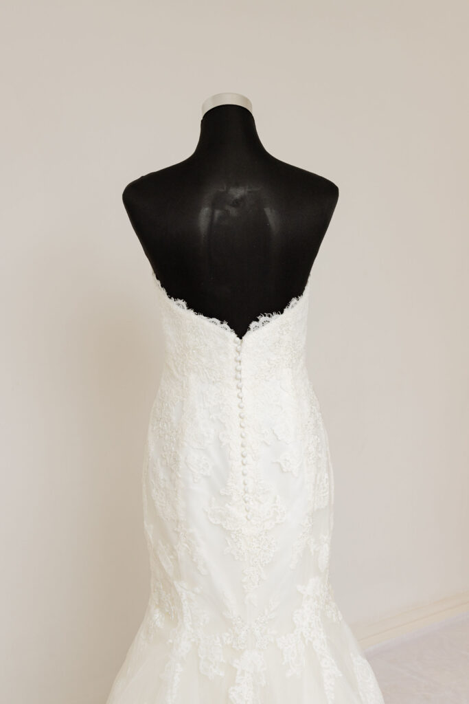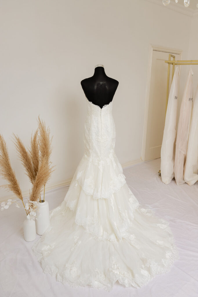 Fit & Flare, Sweetheart neckline, low back, strapless and floor-length dress. has ruffles below the hips and on the edges they are flower embroidered