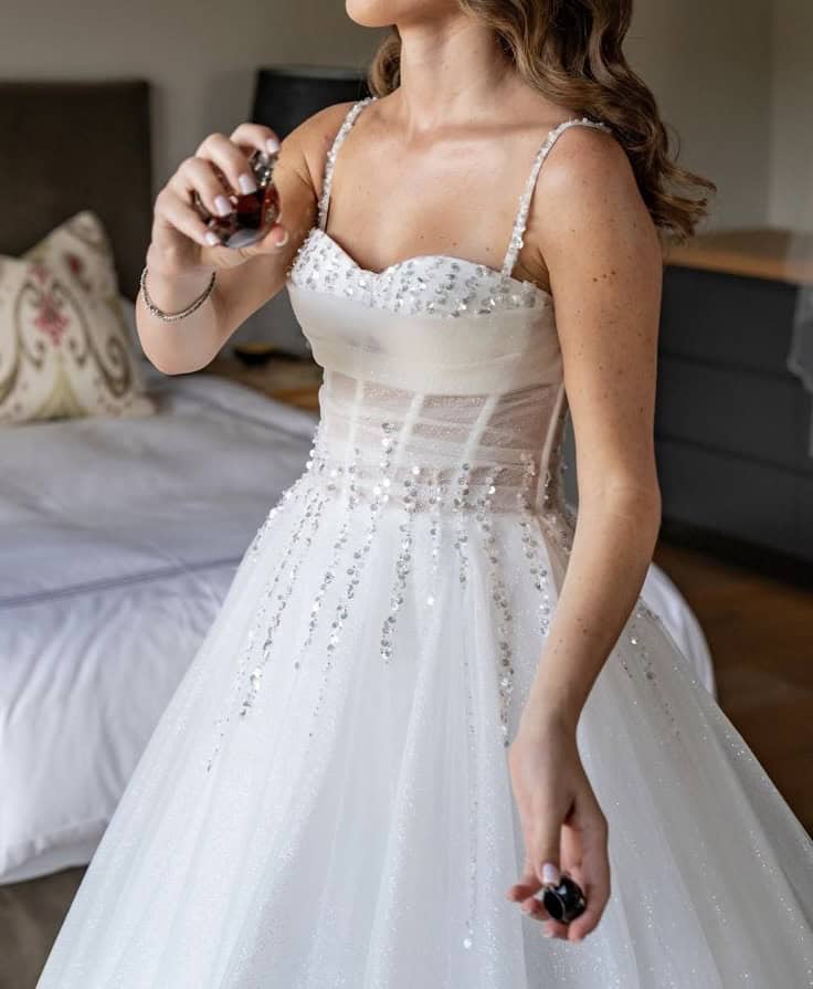 The silhouette is elegant and timeless, with the detachable sleeves offering versatility for both the ceremony and reception. The petticoat adds gorgeous volume and shape, while the veil completes the classic bridal look.