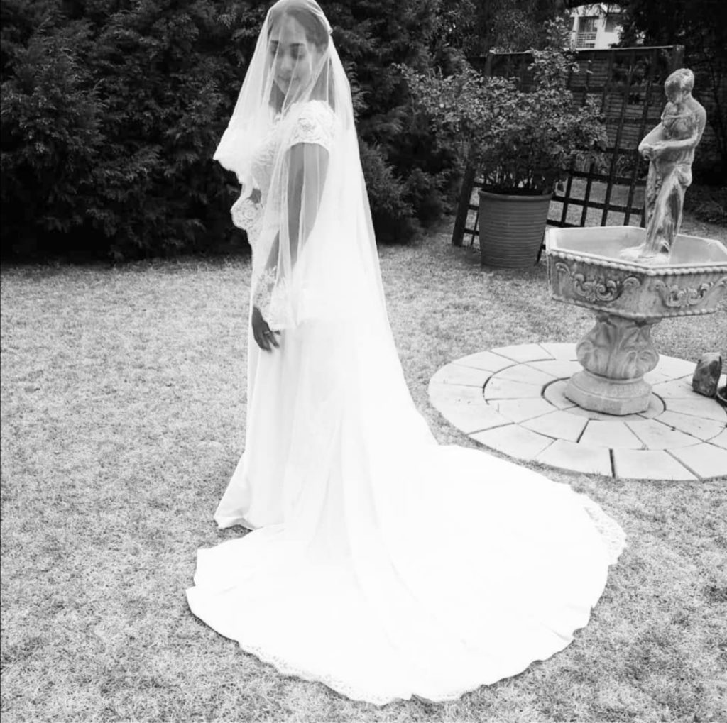 Beautiful ivory lace and satin dress, with detachable satin train and net lace embroidery veil.