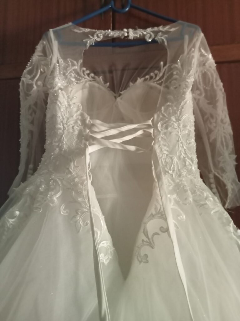 Beautiful Lace and Pearl Princess Dress size 34-36. Worn once and has been dry-cleaned. Includes dress hoop and travel bag.