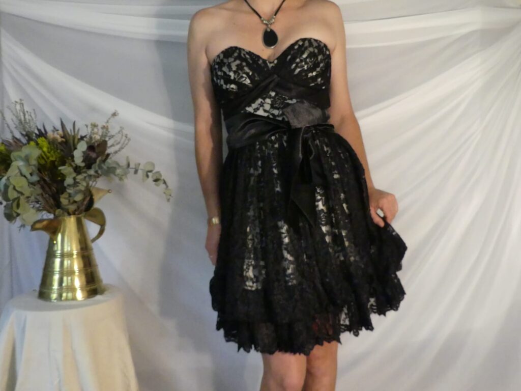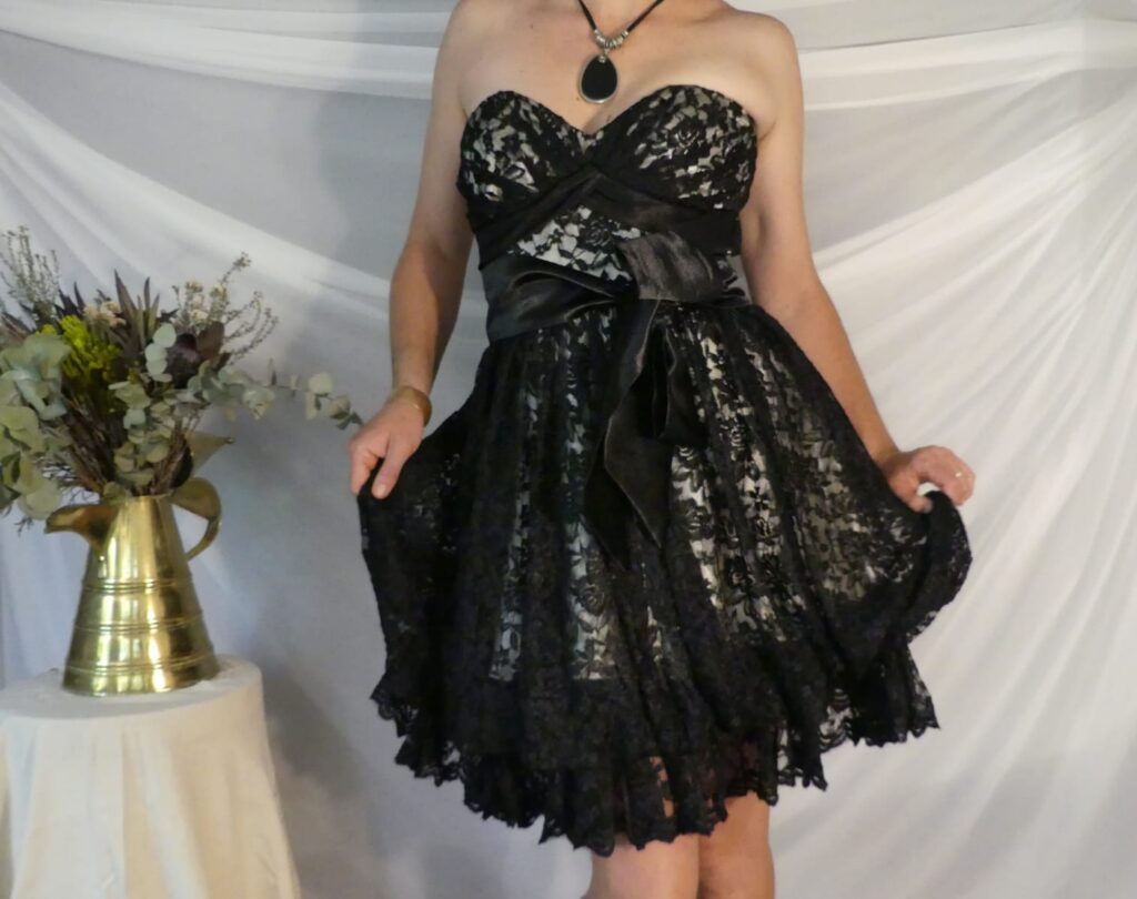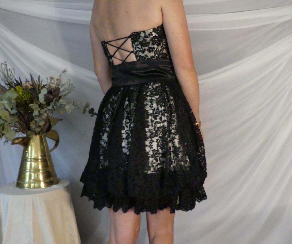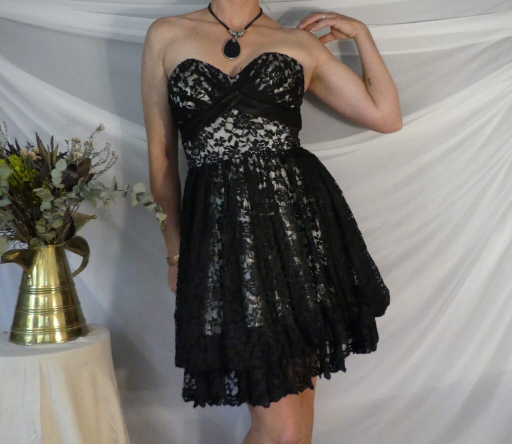 A beautiful South African designed vintage styled dress, made from embroidered black lace over cream silk, with a corset-tied back. The dress is strapless and sits extremely well on an A, B or C bust (as it is corset adjusted). The dress has an underskirt of black silk, and is wonderful to wear. Worn once - a perfect maid of honour/bridesmaid/event's dress/formal wear.