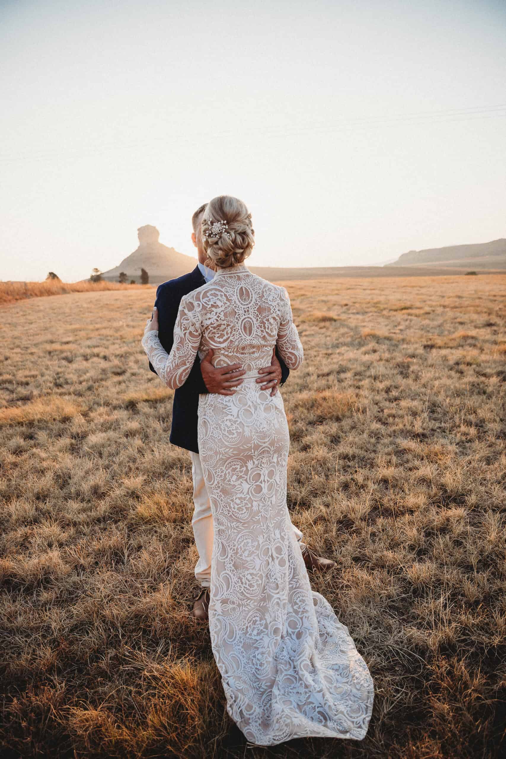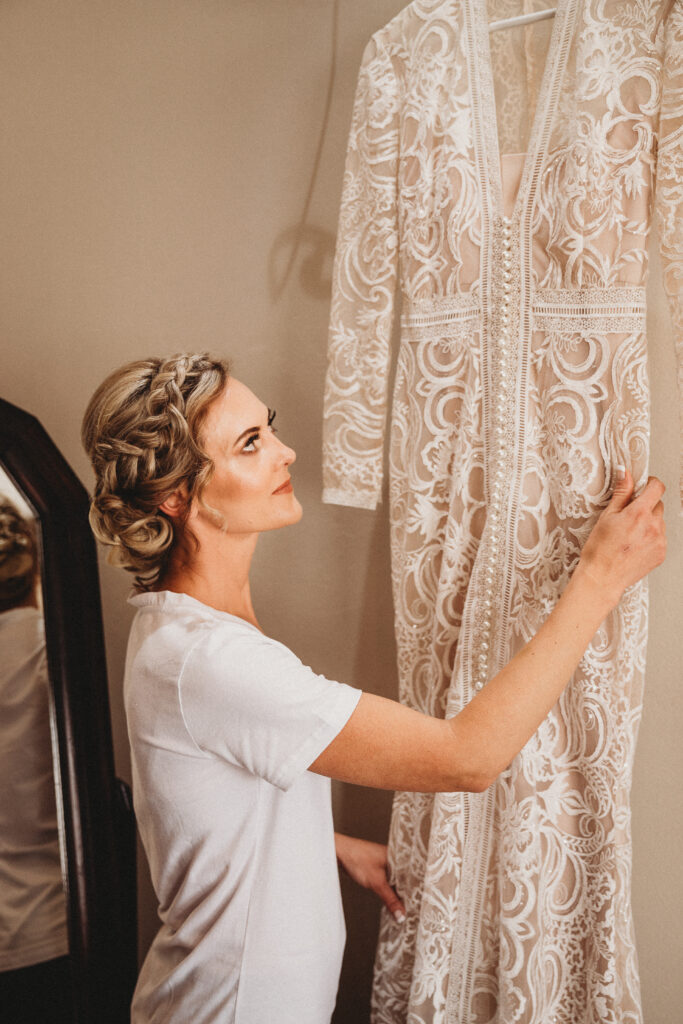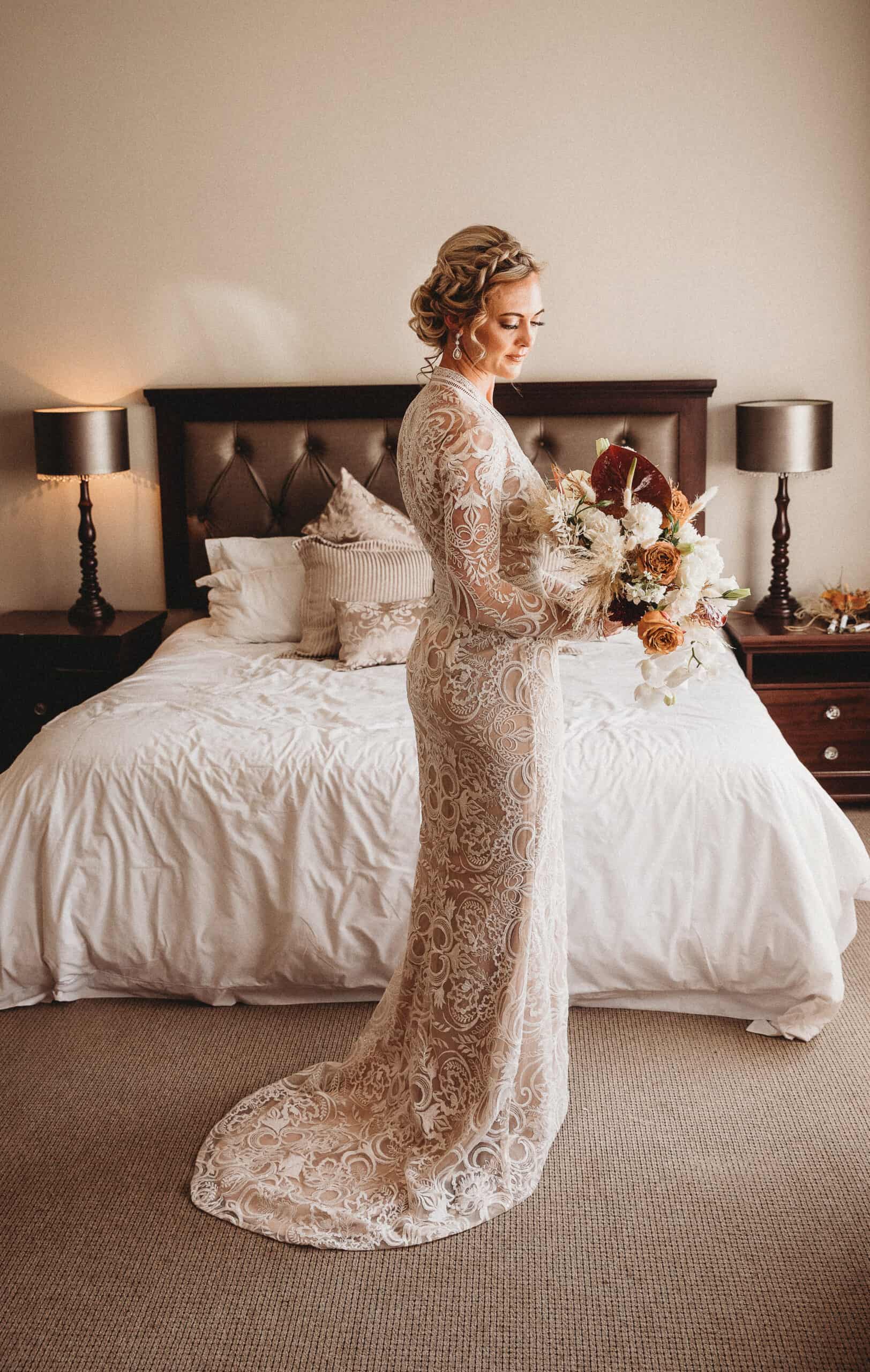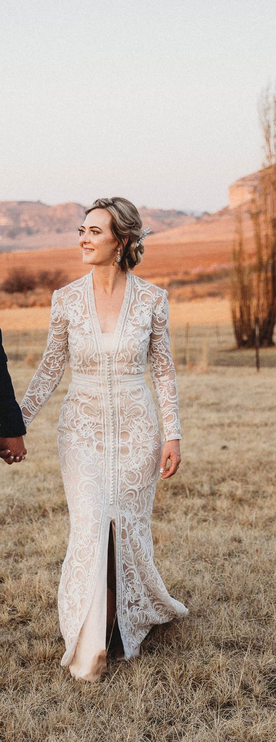 Stunning bohemian style lace designer wedding dress. No permanent alterations done to the dress, I put a seam infront of the dress at the bottom to shorten the length, which has been removed. Will suit longer brides as well. Colour Ivory lace overcoat with pearl buttons and Champagne lining dress, will fit size 6 - 8. Long veil also included.