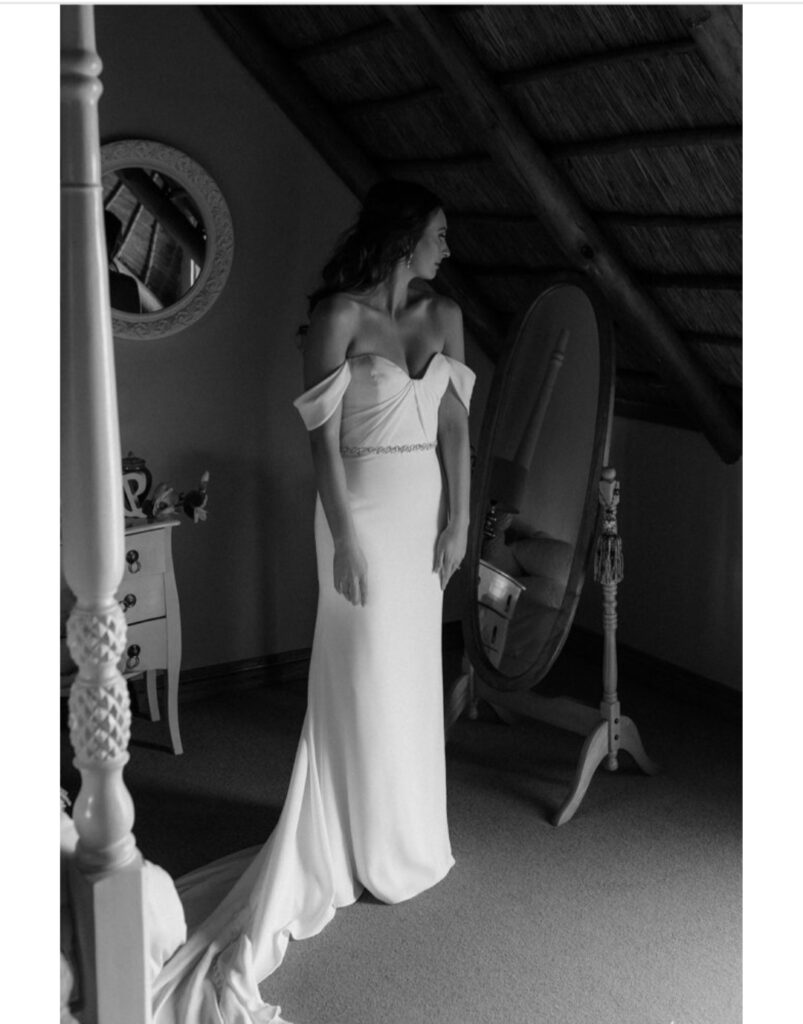 This dress is an ivory coloured, off-shoulder, mermaid dress with a detailed back and a crystal belt sewn in which can be removed if desired.