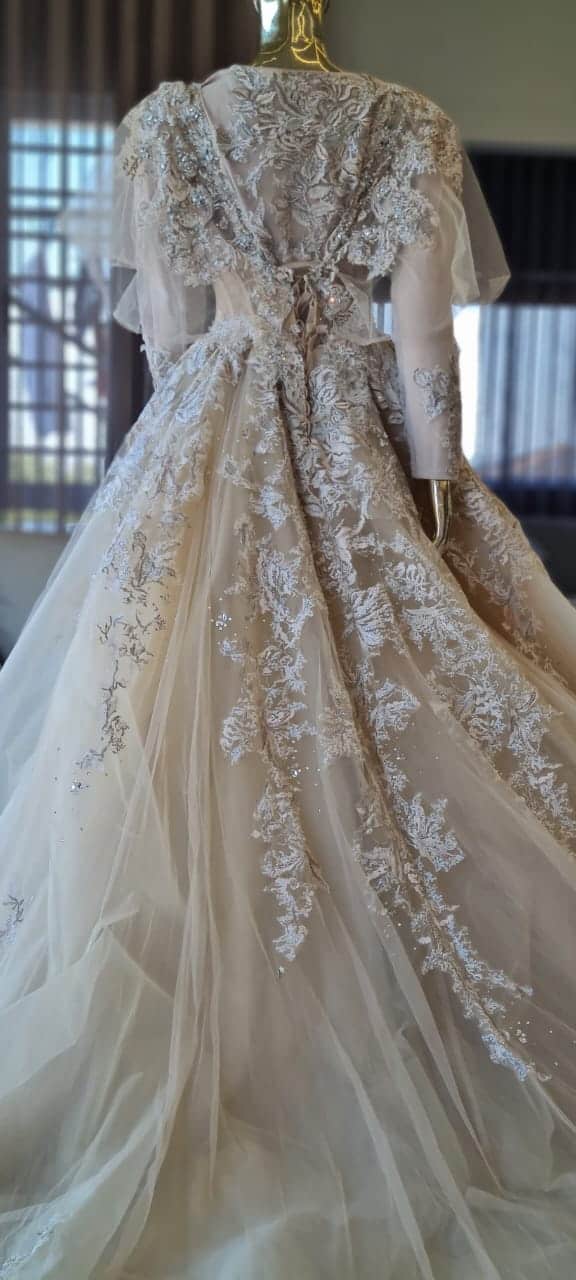 _Bridal Gown_ Size 36-38 2M Trail Worn once for a few hours Colour - Champagne Comes with an inner if you want to wear it modestly Kindly contact me should you have any further queries
