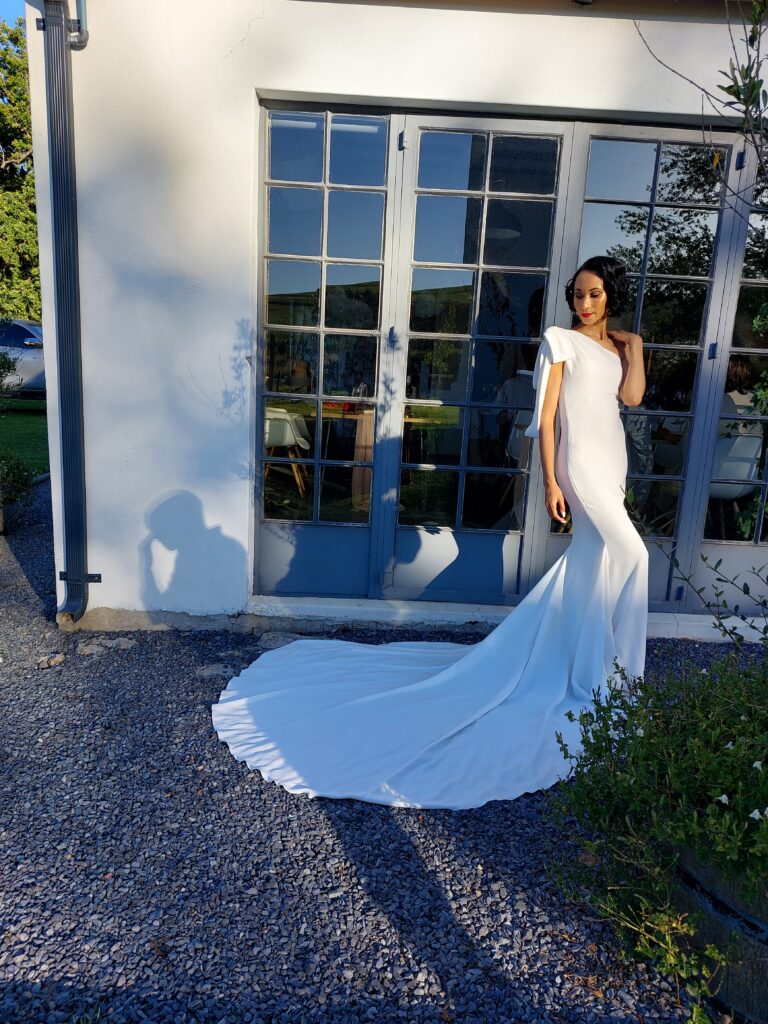 An avant-garde mermaid gown made of the softest stretch georgette creates the ultimate goddess allure. The one-shoulder neckline accented with an effortlessly elegant bow brings an air of vogue to this ultra-sleek gown. Fabric: Stretch Georgette