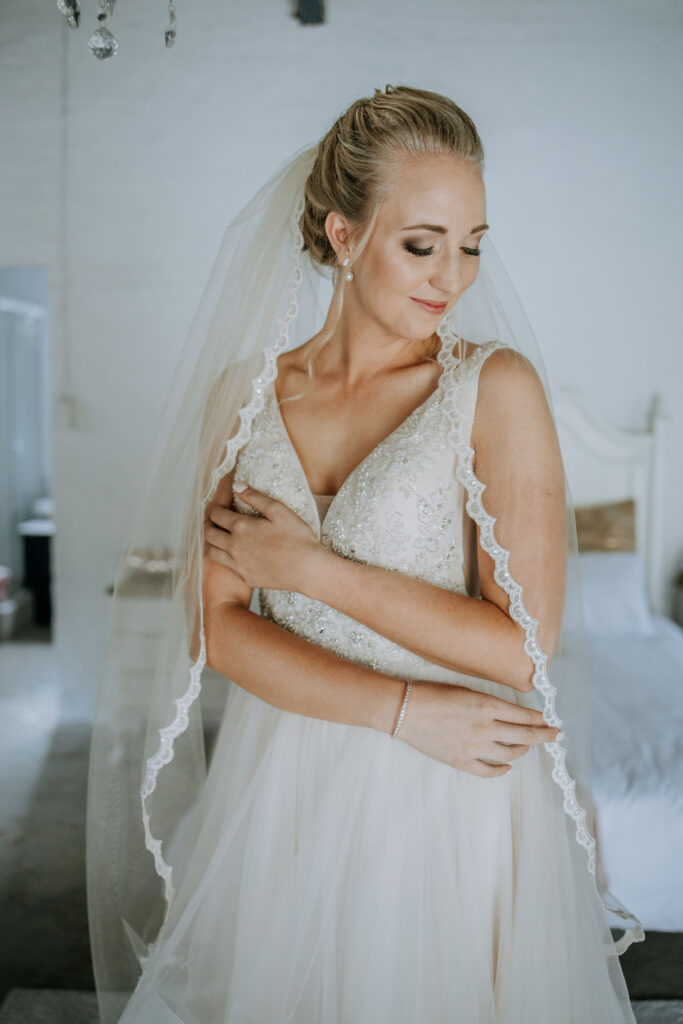 Champagne colour wedding dress with veil. Detailed beaded bodice with lace details. Size 8/10 Only wore once, has been professionally dry cleaned. Price negotiable.
