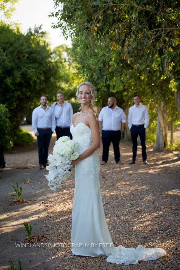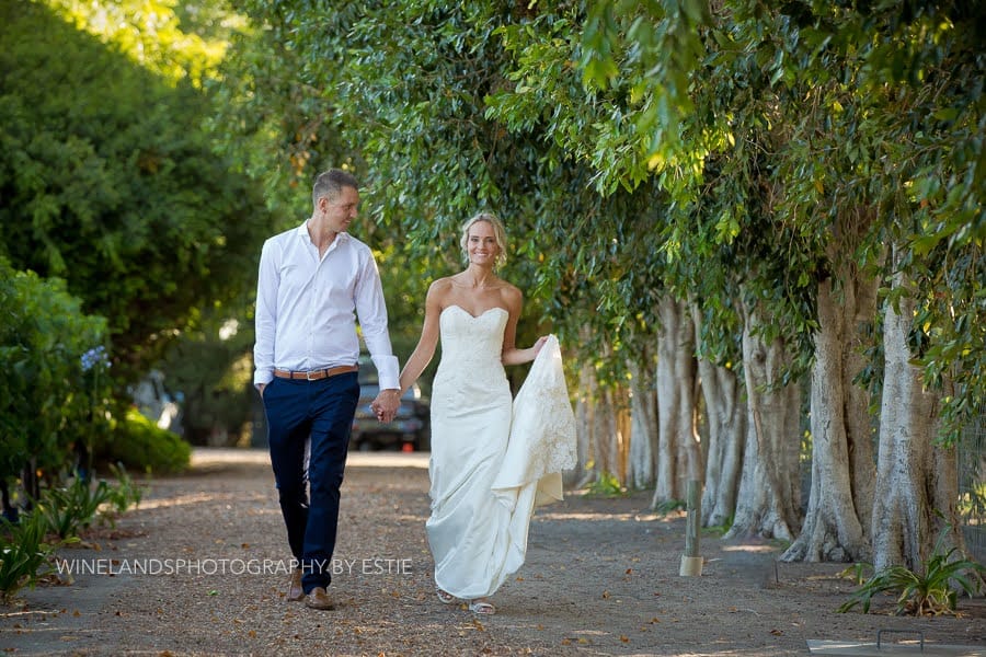 There is a long embroidered train which can be tied underneath to create bustle so it no longer trails on the ground.