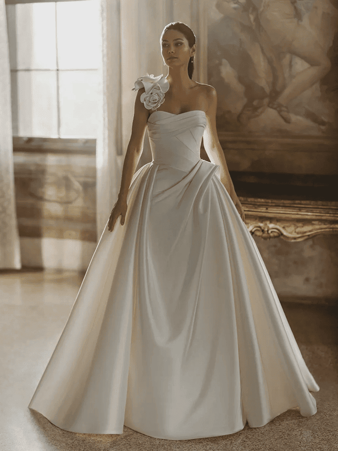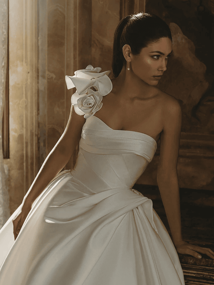 This elegant and show-stopping ballgown, Pen-Liv COCO design, which features a dramatic silhouette through its beautiful and luxurious Mikado fabric that exudes sophistication and grace. Never been used nor fitted, brand new in wedding dress cover. The structured bodice flatters the figure, while the full skirt adds drama and flair. The one-shoulder 3D floral detail is a complementary addition to this classic gown. EASILY AJUSTABLE UP TO TWO SMALLER SIZES', ON OWN COST. PRICED DISCOUNTED FOR NOVEMBER 2025! COME TO VIEW THIS ONCE IN A LIFETIME OPPORTUNITY. Also view: https://www.bridalreflections.com/bridal-dress-designers/pen%c2%b7liv