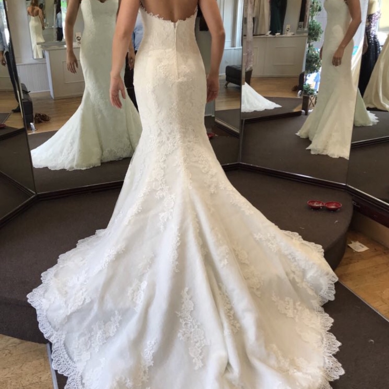 Inspiring tulle mermaid dress with a sweetheart neckline. A marvelous creation with lace and guipure motifs that embellishes the body. This dress is was imported and specially ordered from Pronovias in Barcelona with added swarovski crystal detail to the bodess and trail (Minimal ivory crystals) as well as to the Pronovias veil which is a 3m cathedral veil with matching lace detail on the dress. The dress has only been fitted once and has not been altered to fit at all, so all of the alteration hems are in place. This dress is a dream dress for the bride that has a few curves to show off elegantly. The trail can be tucked in and buttoned to the inside if the dress for the later evening celebrations.