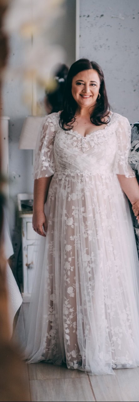 Ivory and Nude A-line angel sleeve wedding dress with sweetheart neckline, soft tulle veil also included.