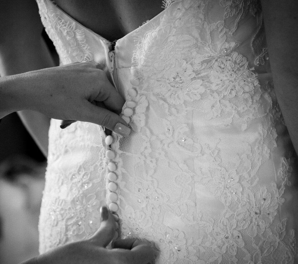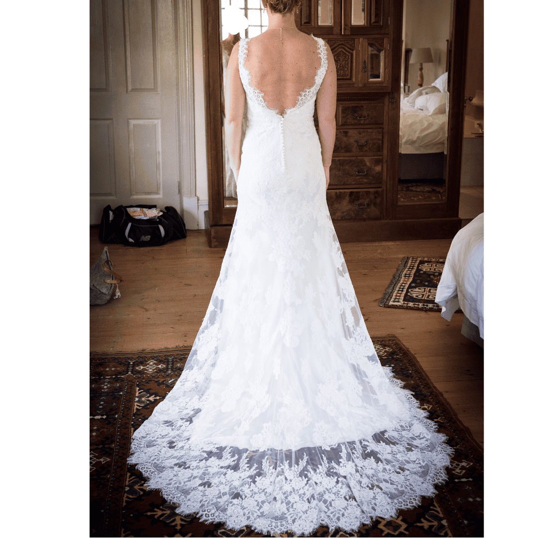 Ivory lace wedding dress with chapel train and V neckline. Attention to details with buttons on the back. The dress comes with a separate ivory satin lining. A very comfortable dress, allowing for ease of movement on your special day.