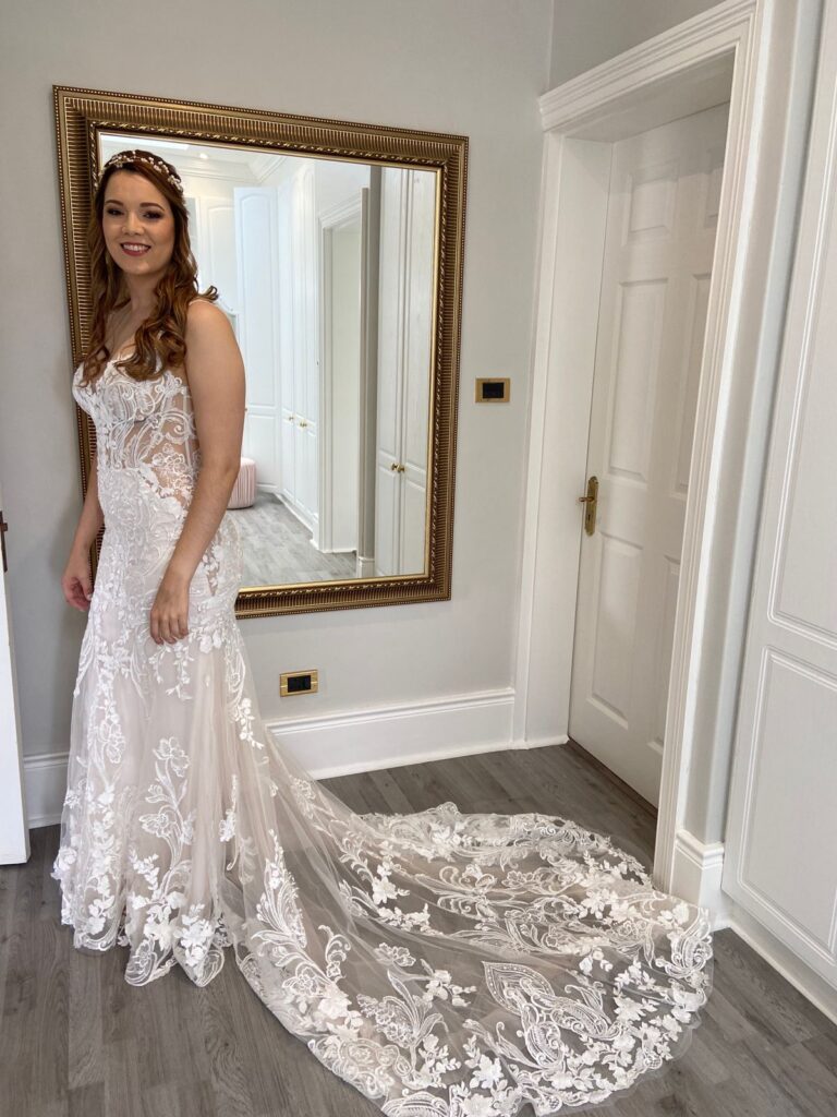 Neda wedding dress for sale. Fitted dress with beautiful lace detail. Dress bought in November 2021 from the Wedding boutique. My height= 1.73meters.