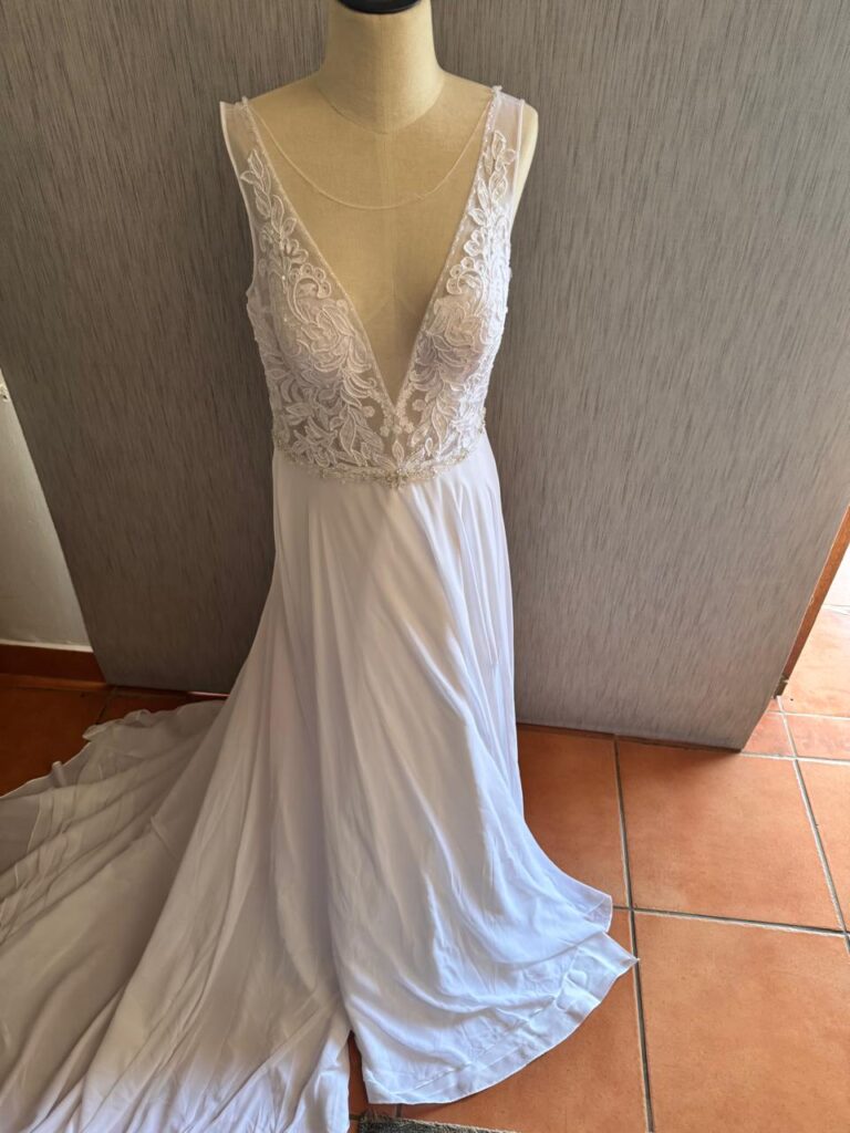 https://brideandco.co.za/product/br02101/ Lace embellishments and barely there mesh panels create a romantic, skin-baring illusion on the bodice of this sophisticated wedding dress, while a cascading soie chiffon skirt, accented with a thigh high slit, adds flowy movement with every step. Complete with shimmering moonstones and beadwork at the waist.