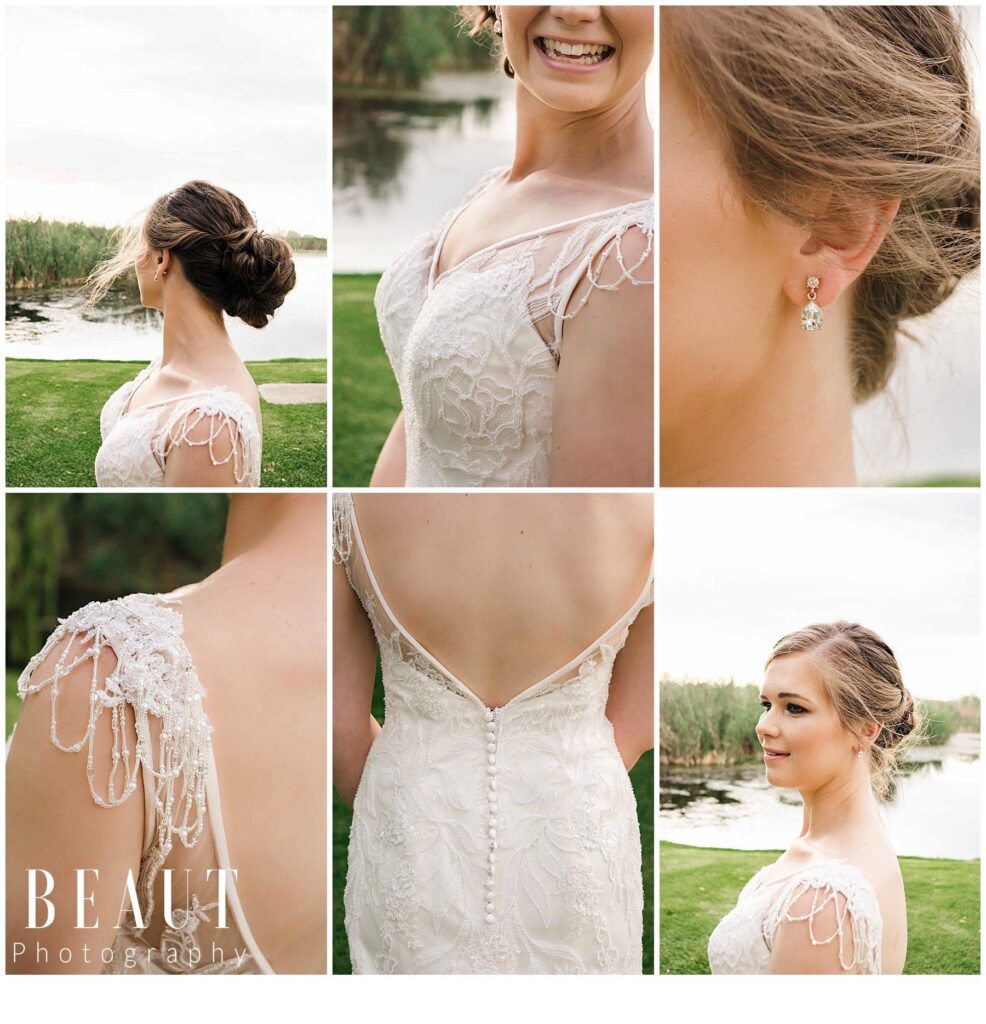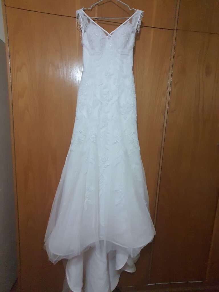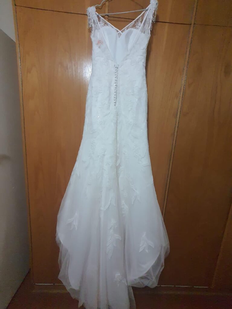 Beautiful and elegant lace dress with beaded detail. The dress is form fitting, but flares out from the hips, making it easy to move and dance in. Tailored for my length- I am 160 cm and wore high heels. bust - 85/ 86cm hips - 88 - 96 cm Colour is a soft shade of off white- between ivory and rose. Matching long veil included. Dress has been dry cleaned. East Rand area.
