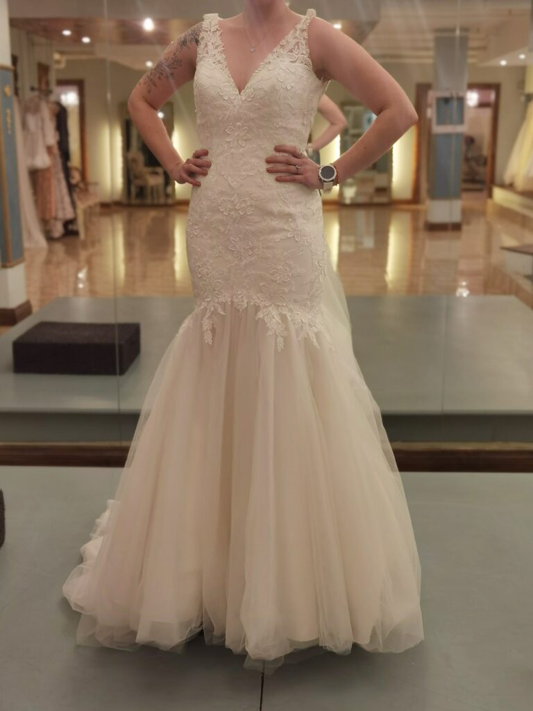This exquisite wedding dress boasts a form fitting detailed lace bodice with a mermaid flare bottom with a train. The detailed lace follows through onto the mermaid flare. With a unique laced back, this dress is one of a kind. The lace has detailed pearls and shimmer.