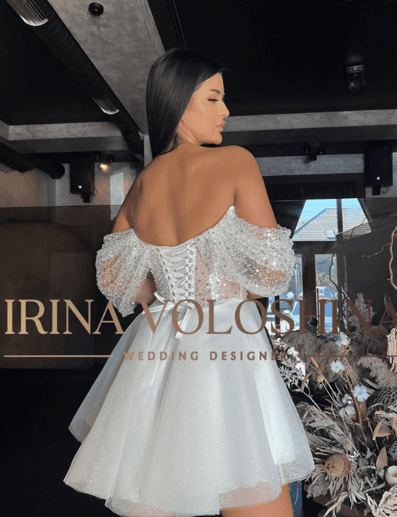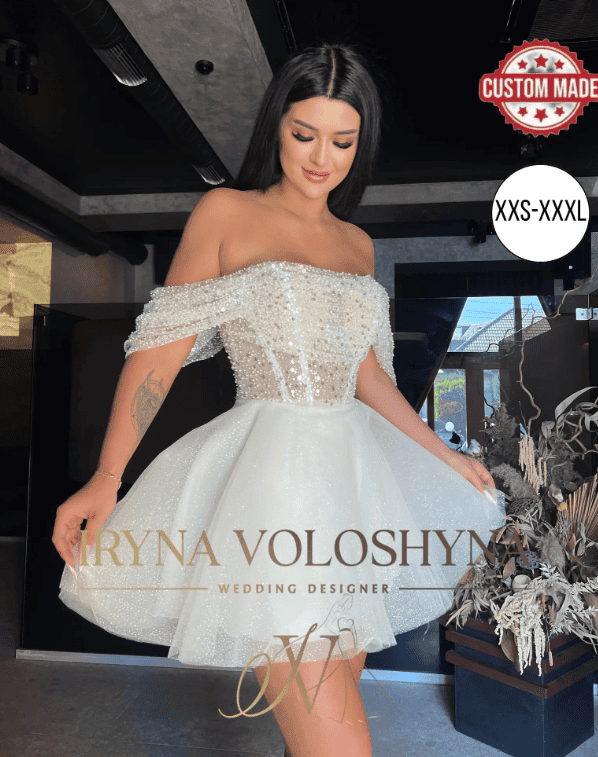 Designed for the modern bride, this handcrafted experience elopement dress features a dazzling beaded corset bodice, delicate off-shoulder sleeves, and a shimmering A-line glitter skirt that moves beautifully with you.
