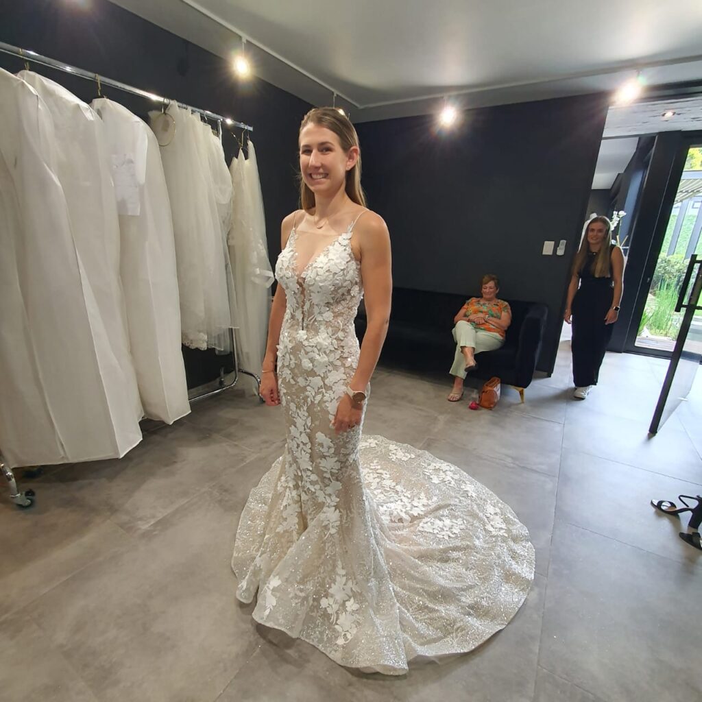 An opulent masterpiece adorned with intricate hand-placed lace and shimmering beadwork.