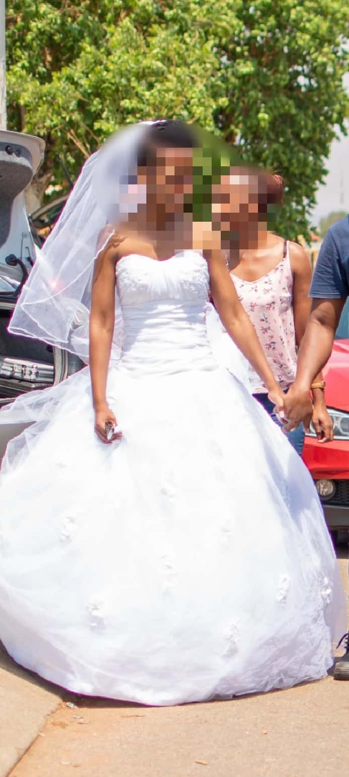 Boob tube ball gown wedding dress, with a tail.