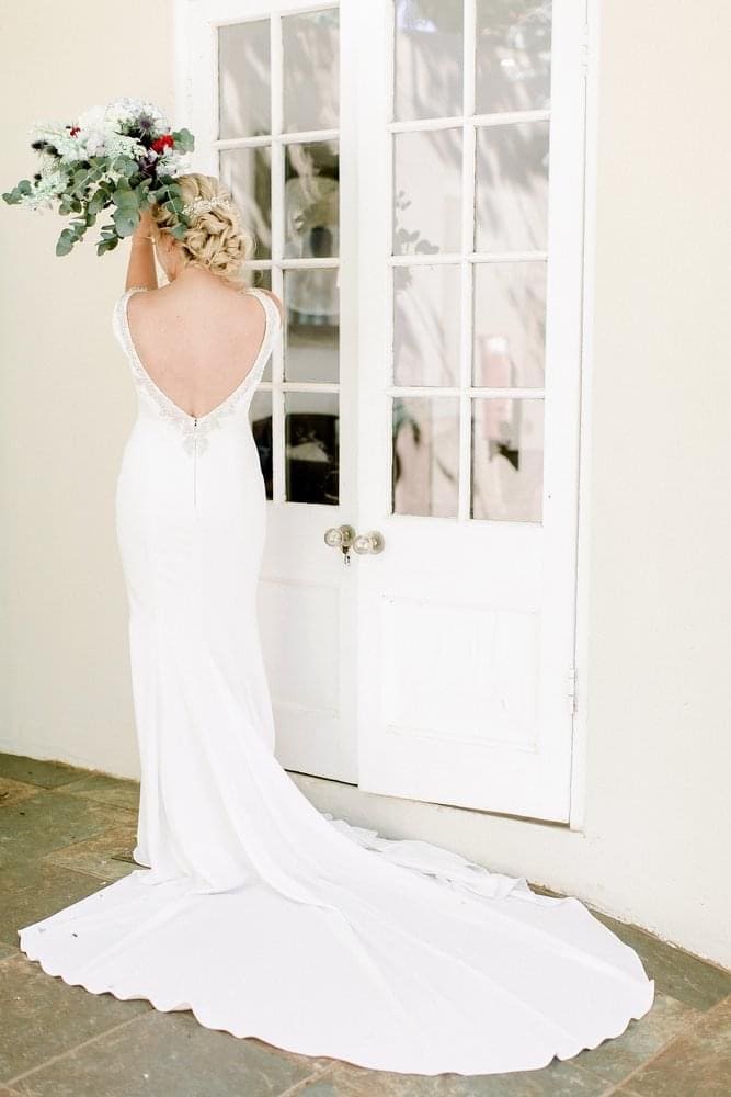 Pronovias Tatiana boat neck, low v-back Crepe Gown. Colour: Ivory Size: UK 10 Train: Semi-cathedral Key features: Low v-back adorned with beaded features. Slim fit. Mermaid style dress Alterations: Small alterations made at the waist and bust for perfect fit. Additional embellishments added to the front of the dress.