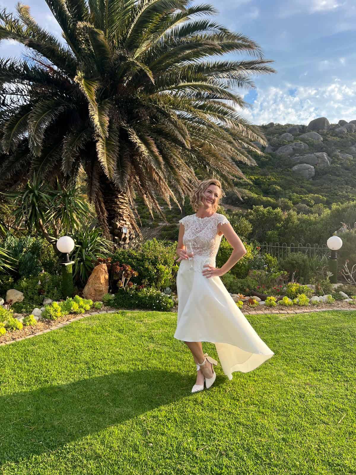 A Duchess satin tea length skirt with a train with buttons on the skirt. The bodice is a translucent beaded Italian imported lace with a key hole back. Small patterns of the lace are sewn to the top of the skirt for detail. The skirt is shorter in front and longer in the back.