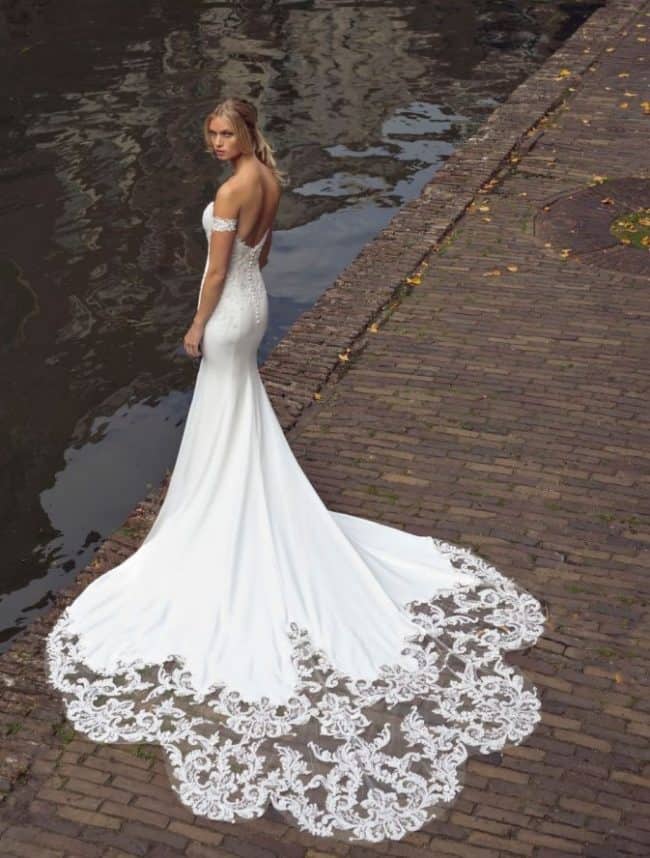 Crafted from feminine crepe, the fitted silhouette features a beaded lace bodice, elegant detachable arm cuffs, and a low-keyhole back for subtle drama. The crepe skirt hugs one's curves before flowing into a show-stopping lace train.