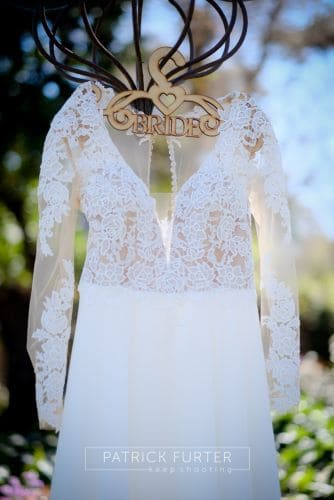Button up back, long train chiffon wedding gown with illusion lace long sleeves with pops of sequence for some glitz.