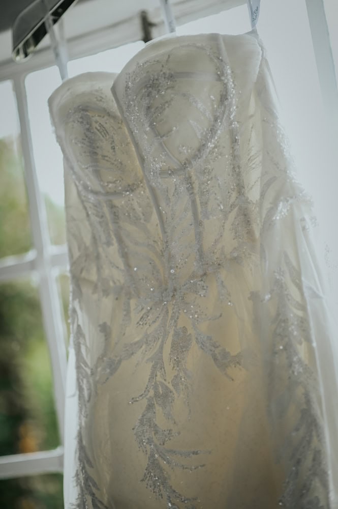 I had the Aline dress altered for a more fitted unique front. It's hand stitched so can be let out back to original aline if needed. The dress has beautiful details all over. . Worn once and can be adjusted for a size up or down.