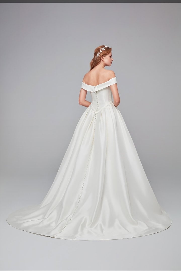 Beautiful elegent simple Ivory Ballgown dress size 10 off the shoulder design with a belt like elegant bow buttons at the back at the zip linin of the dress and has a special feature *pockets* if you would like to put your lip gloss or cell phone during the wedding ceremony. If you are a bride that loves simple but yet elegant this dress is your dream dress.❤️