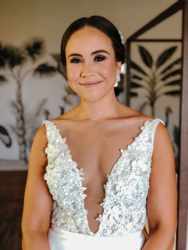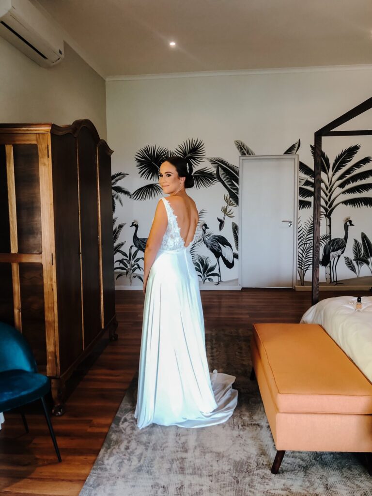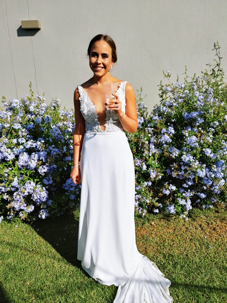 Tailor made wedding dress by Robyn Roberts with detailed beaded top and elegant and simple bottom. The top of the front of the dress is low cut, with a bra stitched in (size 34A), and the back of the dress is also low cut. I am 168 cm tall and the dress was the perfect lenght. This was the most comfortable dress and perfect for dancing all night long at your wedding!