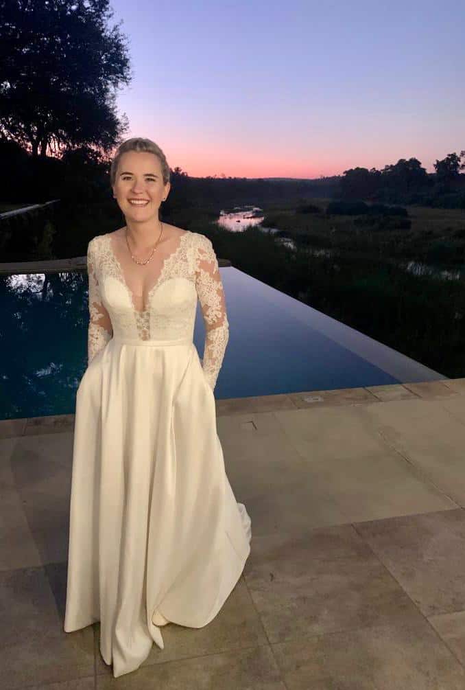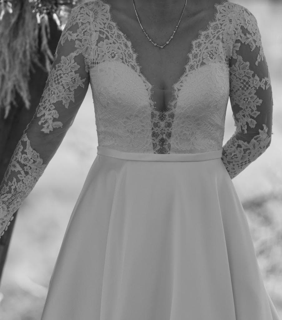 Stand out in this elegant gown. Featuring a V-back, plunging neckline, and long sleeves detailed with a delicate Chantilly lace. A bias belt compliments the natural waist and leads into a mikado A-line skirt. Scalloped eyelash lace details the neckline and cuffs while pockets add a modern touch.