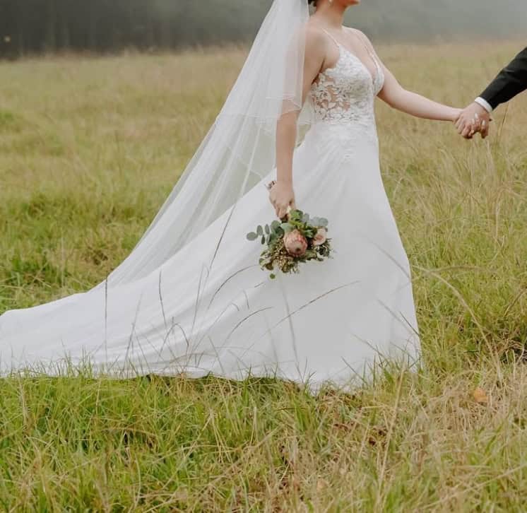 Full circular skirt with floaty chiffon flowers to create and effective lace trail