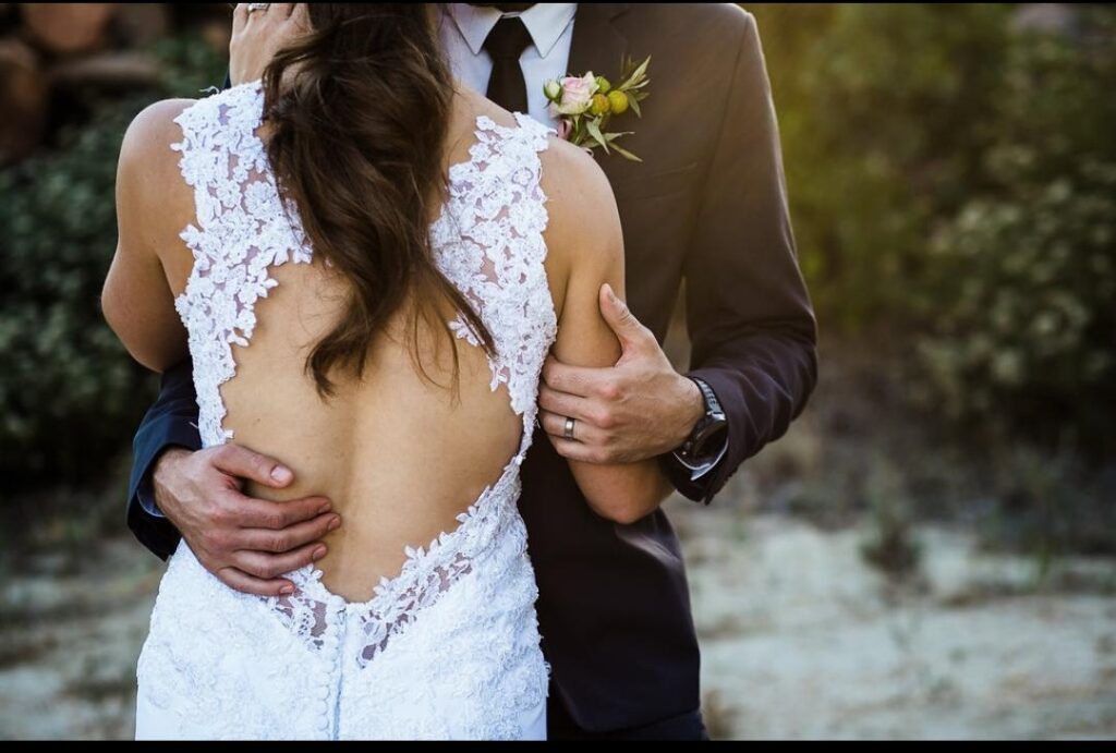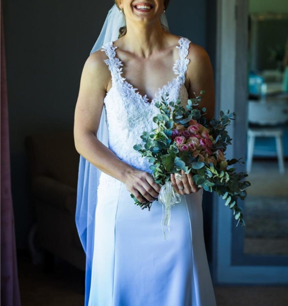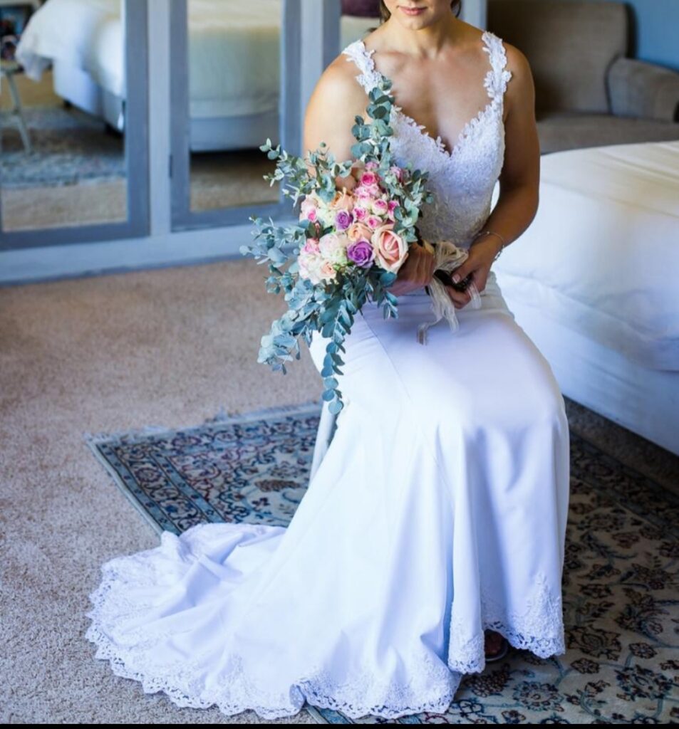White wedding dress custom made and only worn once.No alterations made. 2 types of lace in front that reaches just below the belly area and over hips. Straps over shoulders with build in breast cups. Semi open back.